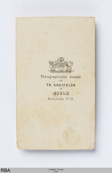 Fotoatelier Creifelds Hochstraße 19; Carte-de-Visite mit einer Porträtfotografie eines Mannes von dem Fotografen Theodor Creifelds, hier die Rückseite